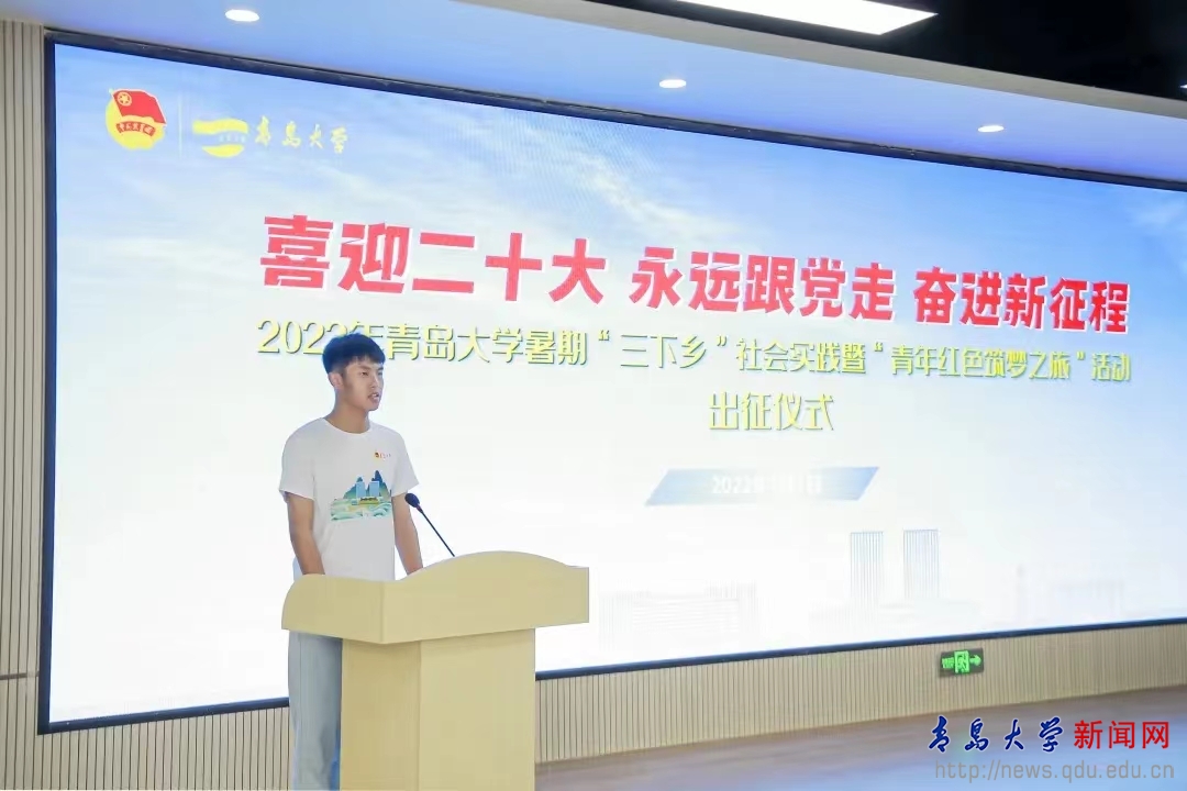 新闻网讯 7月1日下午,我校2022年暑期“三下乡”社会实践暨“青年红色筑梦之旅”活动出征仪式在大学生科创文化中心二楼多功能厅隆重举行。校长夏东伟,校党委常委、副校长刘彩云出席出征仪式。仪式由校团委书记解文斌主持。崂山团区委书记付苗苗,学校纪委、党委组织部、党委宣传部、合作发展处、教务处、党委学工部、国际教育学院等相关单位负责同志,相关学院(部)共青团工作分管负责同志和团委主要负责人,以及暑期实践团队的指导教师和学生代表参加仪式。