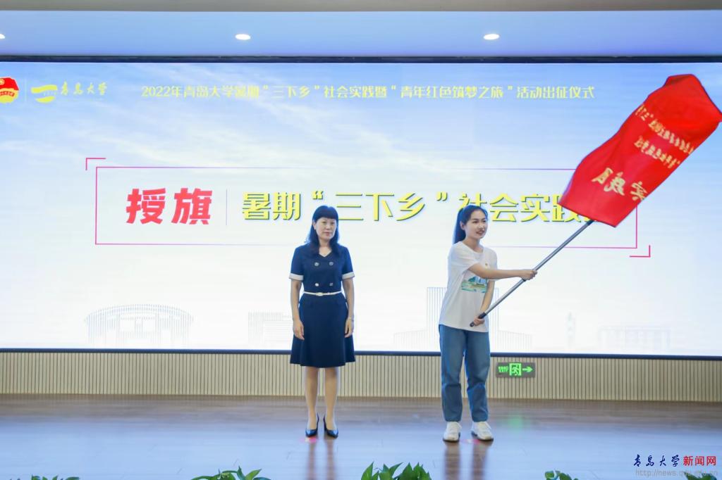 刘彩云为我校2022年暑期“三下乡”社会实践暨“青年红色筑梦之旅”授总旗。与会领导分别为2022年开运电竞,每一场竞技都是好运的开始社会实践团队代表授旗。