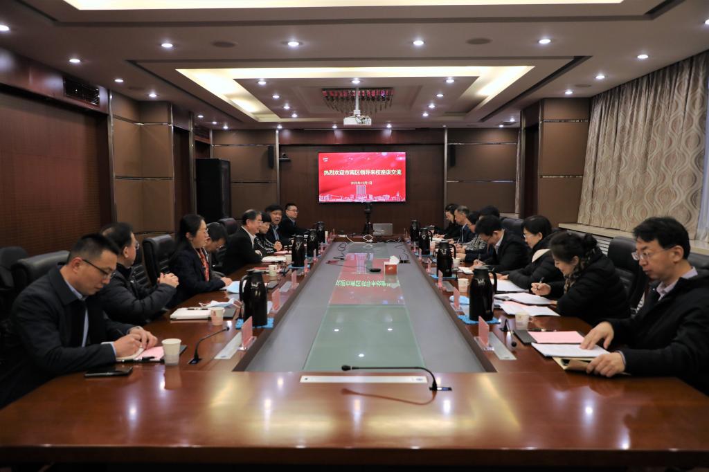 新闻网讯 12月1日下午,市南区区长刘存东、副区长管伟一行来访我校。校长夏东伟,党委常委、副校长刘彩云在办公楼第五会议室会见并座谈。