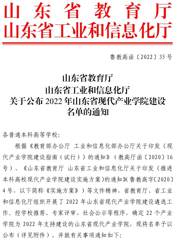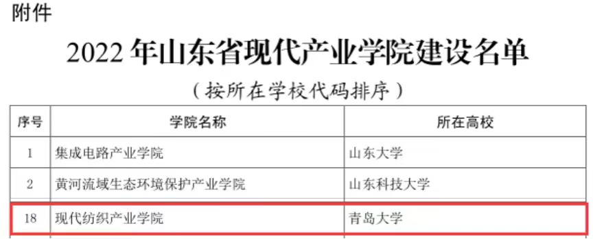 新闻网讯 近日,山东省教育厅、山东省工业和信息化厅公布了2022年山东省现代产业学院建设名单,学校申报的“现代纺织产业学院”获批立项,这是我校继海信人工智能学院之后,获批的第二个省级现代产业学院。