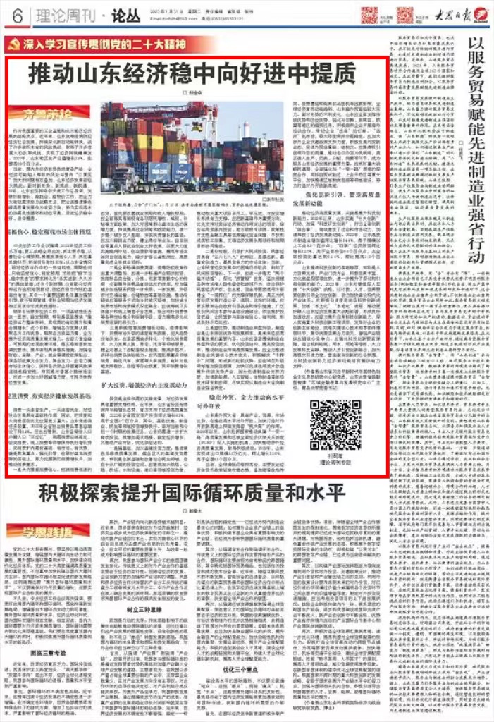 校党委书记胡金焱在《大众日报》发表理论文章谈“山东经济发展”