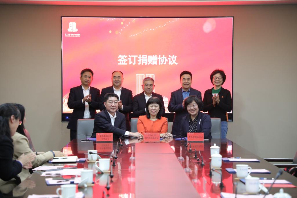 仪式上,在胡金焱、王伟、孙涌、肖黎、刘世海见签下,刘彩云、盛梅、董建明分别代表三方签订捐赠协议,刘彩云代表学校接受荣华建设集团捐款支票,胡金焱为孙涌颁发了捐赠证书。
