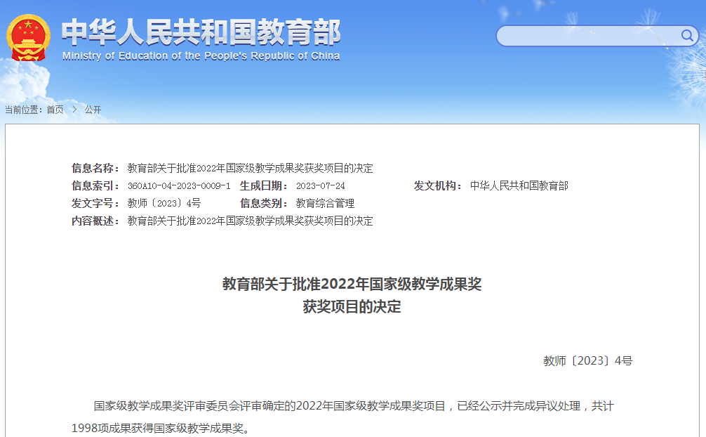 新闻网讯 7月24日,教育部发布了《教育部关于批准2022年国家级教学成果奖获奖项目的决定》,作为主持单位我校共2项成果上榜,获奖数量位列山东省省属高校第一,取得新突破。