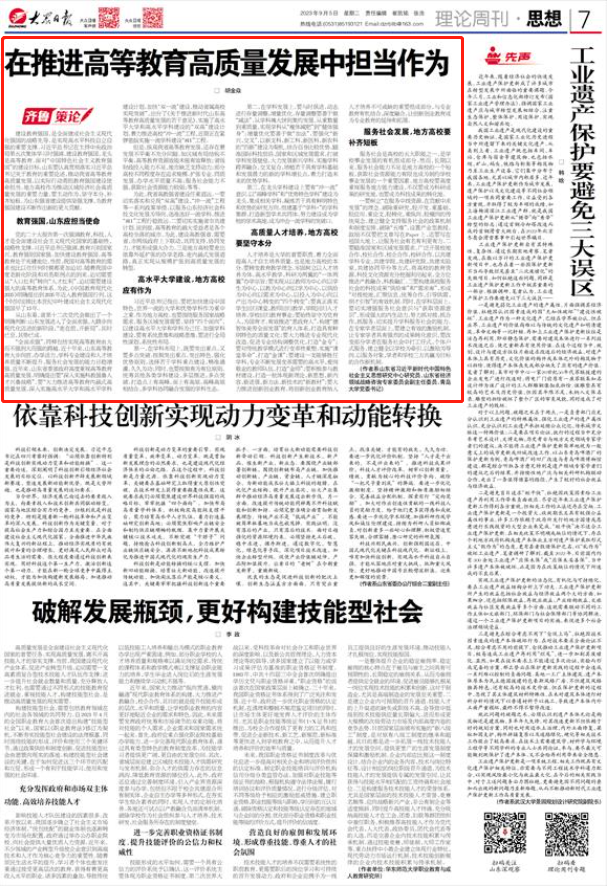 新闻网讯 9月5日,《大众日报》刊登我校党委书记胡金焱的理论研究文章“在推进高等教育高质量发展中担当作为”。