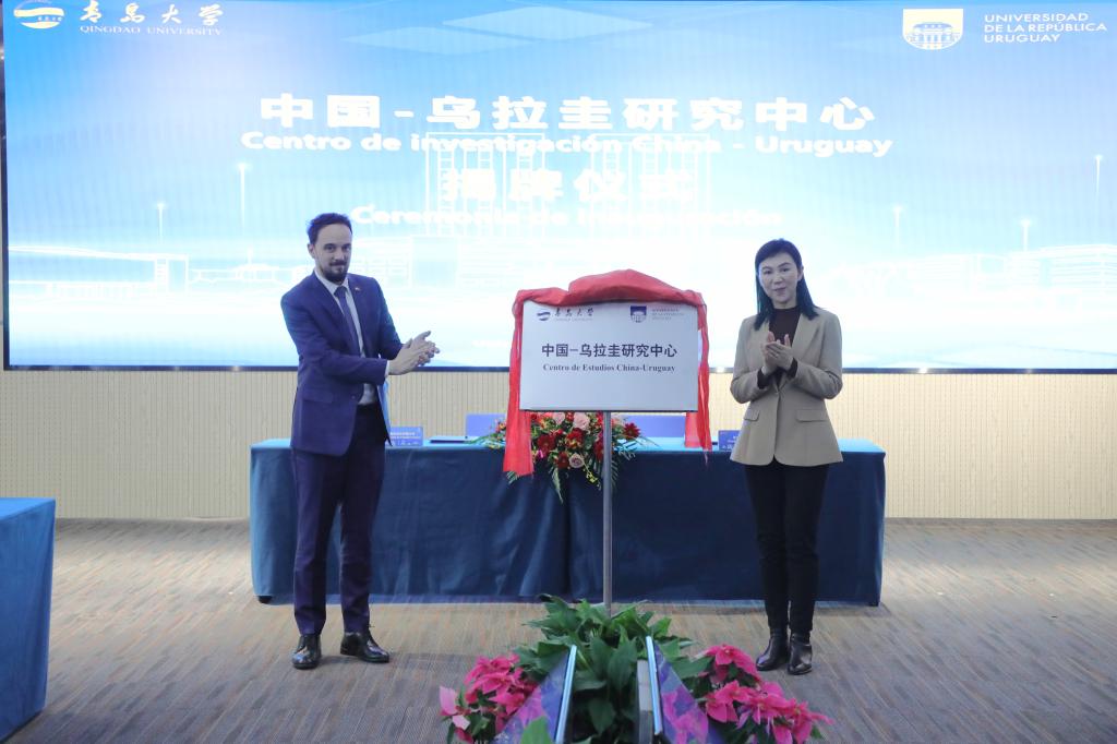 在签约和揭牌仪式环节,胡金焱和罗德里戈·阿里姆分别代表两校签署了共建“中乌生物纳米制药联合实验室”协议并揭牌。塞巴斯蒂安·班德拉和真珠为“中国-乌拉圭研究中心”揭牌。
