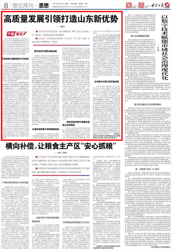 新闻网讯 2月6日,《大众日报》刊登我校党委书记胡金焱的理论研究文章“高质量发展引领打造山东新优势”。