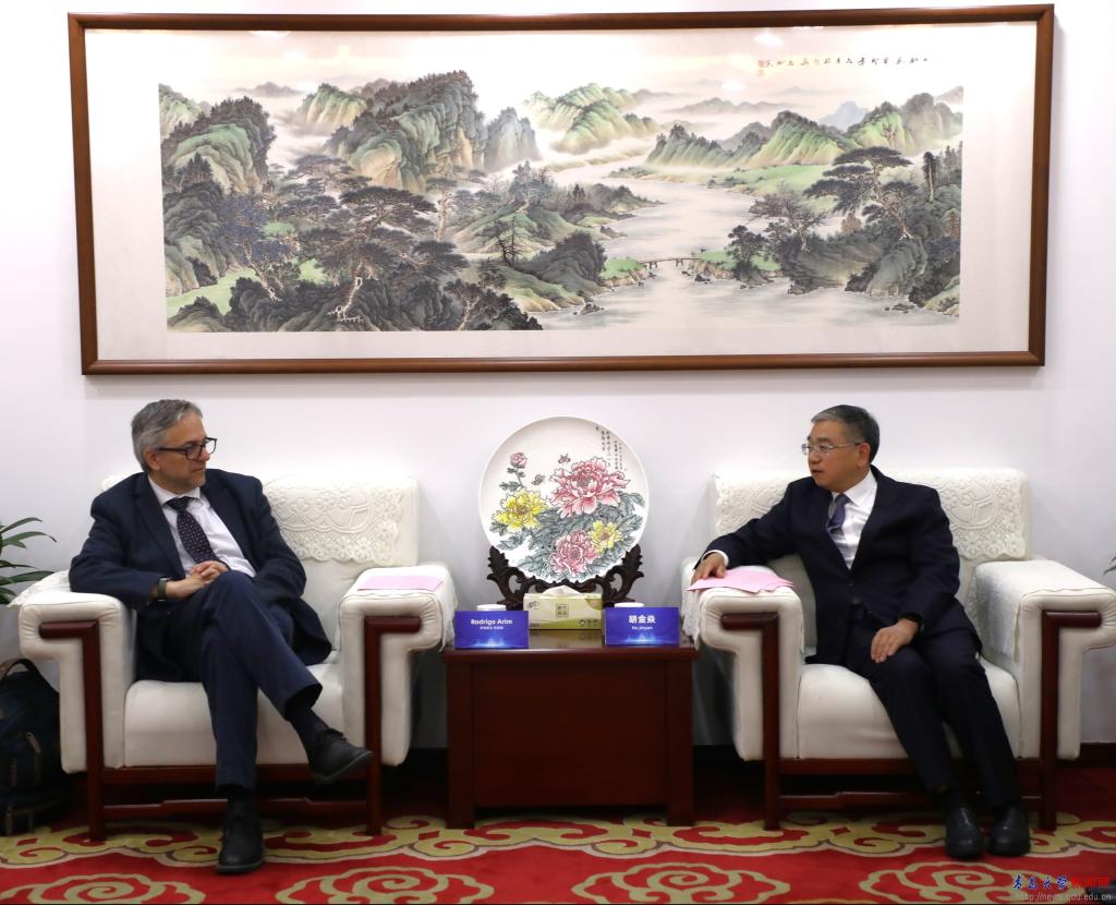 胡金焱在办公楼320会客室会见了乌拉圭共和国大学校长罗德里戈·阿里姆,古巴哈瓦那大学对外西语系主任莉迪亚·库巴、制药与食品学院院长阿莉西亚·卡萨里埃戈和国际处副处长英迪拉·费雷尔。