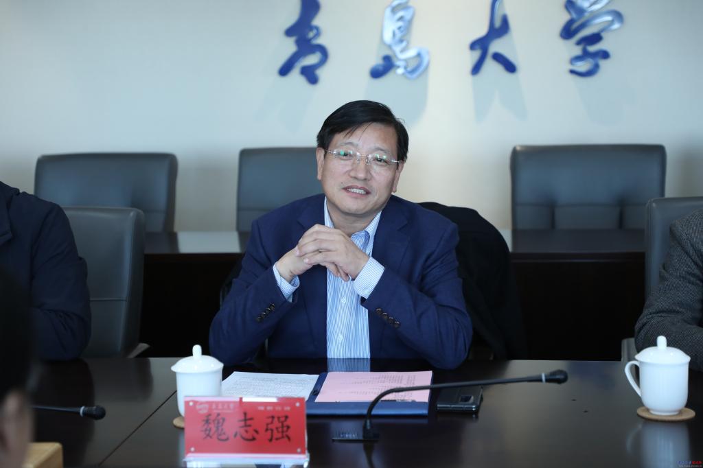 魏志强代表学校对韦仕珍一行来校调研交流表示热烈欢迎,他简要介绍了我校历史沿革以及在学科建设、人才培养、社会服务、国际化办学等方面的发展情况及取得的成果。他表示,广西民族大学具有鲜明的民族特色和深厚的文化底蕴,希望以此次交流为契机,促进两校在学科交叉融合、特色专业建设、教育国际化等方面资源与经验的双向共享,携手并进,助推两校高质量发展。