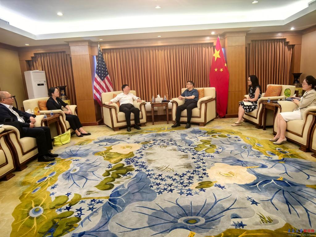 在中国驻洛杉矶总领事馆,总领事馆教育参赞黄伟等接待了代表团一行。黄伟介绍了洛杉矶领区内的高等教育基本情况,并针对我校实际情况提出了对美交流建议。双方就优化交流美国高校布局以及青年使者交流学习计划(YES项目)等进行了深入交流。