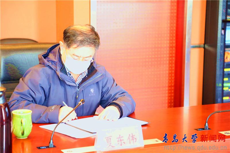 夏东伟动情地说我们作为青大人十分自豪,1月24日,也是大年三十,青大附属医院秦文大夫作为国家第一批援助武汉防控专家组成员前往疫情第一线;我校派出三批援鄂医疗队奔赴武汉,第三批132名医护人员接管武汉同济医院光谷院区重症患者病区;青大附属医院承担着青岛、日照两地市的新冠肺炎定点治疗医院;同时,附属医院收治了山东省首例新冠肺炎确诊病人,并作为首例治愈病人治愈出院;……我校附属医院医务工作者在抗疫一线上演“最美逆行”,用仁心和仁术诠释了“大医精诚、大爱无疆”的医者精神,用使命和担当诠释了“国家需要的时候我就上”的青大精神。“国家需要的时候我就上”的青大精神源于一代代青大人的接续奋斗,新中国成立以来,我校在抗美援朝、援助蒙古和坦桑尼亚、唐山地震、抗洪救灾、汶川地震等国家关键事件和时期都有青大人的身影,在维护人民群众生命安全做出了贡献。