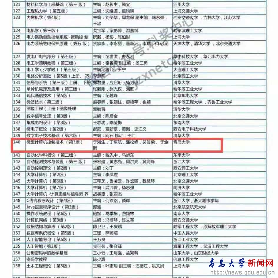 新闻网讯 日前,教育部网站公布了国家教材委员会关于首届全国教材建设奖奖励的决定。我校于海生、丁军航、潘松峰、吴贺荣、于金鹏编写的《微型计算机控制技术(第3版)》获“全国优秀教材二等奖”。