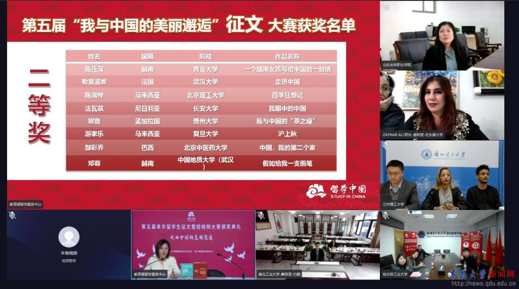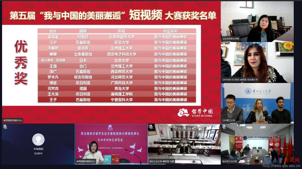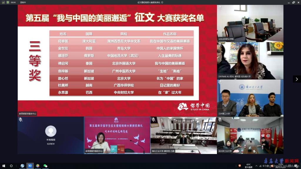 新闻网讯 近日,全国第五届“我与中国的美丽邂逅”来华留学生征文暨短视频大赛颁奖典礼以线上形式成功举办。我校荣获“院校优秀组织奖”。其中,越南留学生陈氏深获得征文二等奖,韩国留学生金世友获得征文三等奖,越南留学生范心芳和泰国留学生吴小梅获得征文特色奖,校友司梵克(德国国籍)获短视频类优秀奖。来自全国近60余所高校和海内外200多名留学生线上参加颁奖典礼。