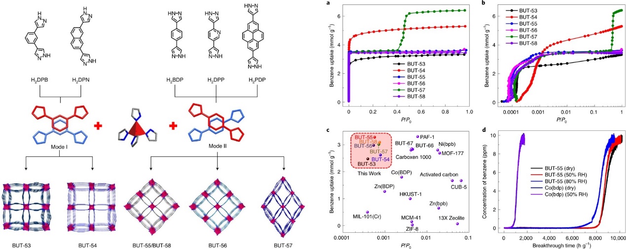 图1. BUT-53~BUT-58的构筑策略及苯吸附性能研究。