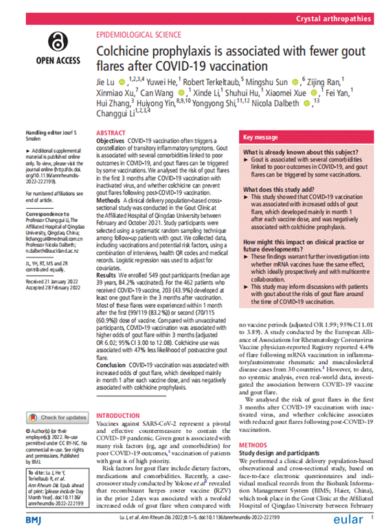 我校李长贵教授团队应用国际首发原创性痛风智能诊疗辅助/科研管理系统,结合当下最关注的新冠疫情相关亟待解决问题,发现新冠疫苗接种与痛风发作风险增加明显相关,而预防性使用秋水仙碱可降低接种新冠疫苗后痛风发作风险。 接种新型冠状病毒Covid-19疫苗是预防控制新冠最经济、安全和有效的手段,在临床实践中,该团队发现新冠疫苗接种后的部分痛风患者发作频繁。为进一步解释该现象,团队设计相关临床试验,分析了接种新冠疫苗后3个月内痛风急性发作的频率,以及服用秋水仙碱对新冠疫苗接种后痛风发作的预防作用。结果发现,新冠疫苗接种3个月内痛风患者急性发作频率显著高于未接种者,预防性使用秋水仙碱可使疫苗接种后痛风发作风险降低47%。痛风患者对于接种新冠疫苗的意愿可能受限于疫苗接种带来的副作用,该研究有助于探讨痛风患者接种新冠疫苗后痛风发作的风险,及预防该风险的策略,对于痛风患者接种新冠疫苗具有一定的临床指导意义。