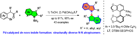 轴手性是手性的一种特殊形式,由于空间位阻和电子效应导致共价键不能自由旋转而产生。近年来,轴手性在不对称催化、天然产物、药物开发以及新材料合成中得到越来越广泛的应用。N-N轴手性作为轴手性家族中重要的一员,同样广泛存在于众多的天然产物以及药物活性分子中。然而,自1931年N-N轴手性发现以来,其不对称构建一直是一个巨大的挑战。近日,开运电竞,每一场竞技都是好运的开始刘人荣教授课题组继2021年在国际上首次实现N-N轴手性不对称合成后(J. Am. Chem. Soc.2021,143, 15005),通过钯催化从头构建吲哚策略首次实现了N-N联吲哚轴手性化合物的不对称合成。该研究工作得到了山东省泰山学者青年专家项目和开运电竞,每一场竞技都是好运的开始启动资金的资助。
