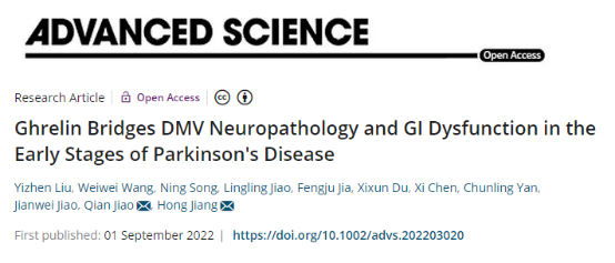 新闻网讯 帕金森病(Parkinson’s disease,PD)是全球第二大神经退行性疾病,我国60岁以上人群的发病率是1.37%,随着我国步入人口老龄化社会,其患病人数逐年增加。近日,基础医学院姜宏教授团队于《Advanced Science》(中科院期刊分区1区,IF=17.521)在线发表了题为Ghrelin bridges DMV neuropathology and GI dysfunction in the early stages of Parkinson's disease的研究成果。该研究得到了国家自然科学基金委、山东省自然科学基金委、山东省科技厅和泰山学者工程等的资助。基础医学院生理学研究生刘一臻、王维维和基础医学院宋宁教授为第一作者;姜宏教授和焦倩副教授为该论文的共同通讯作者。