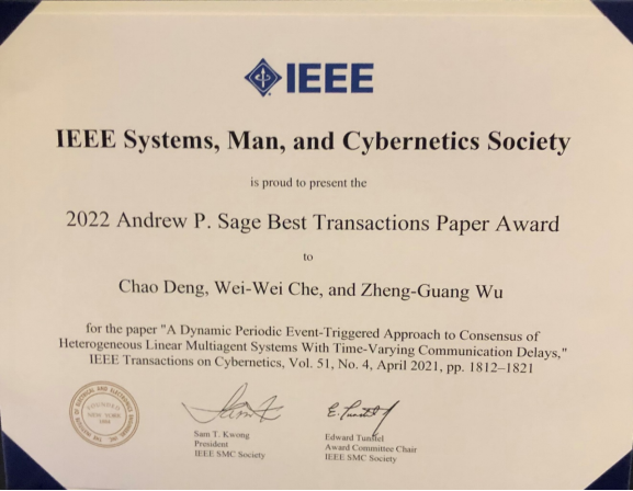新闻网讯 近日,在捷克共和国布拉格举办的IEEE Systems, Man, and Cybernetics Society年会(IEEE SMC 2022)国际会议上,我校自动化学院车伟伟教授团队发表的论文“A Dynamic Periodic Event-Triggered Approach to Consensus of Heterogeneous Linear Multiagent Systems With Time-Varying Communication Delays”(IEEETransactionsonCybernetics, 2021, 51(4): 1812-1821)荣获IEEE SMC学会最佳期刊论文奖(2022 Andrew P. Sage Best Transactions Paper Award)。Andrew P. Sage最佳论文奖是从IEEE SMC学会旗下的4个权威期刊前两年出版的千余篇高质量论文中匿名评选出的最优秀论文,是IEEE SMC学会对智能领域的研究学者所授予的最高学术荣誉。