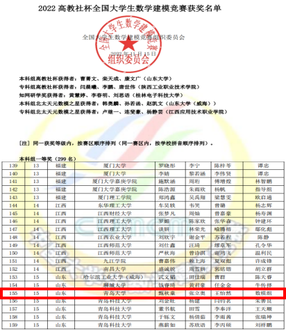 新闻网讯 近日,2022高教社杯全国大学生数学建模竞赛成绩揭晓,经省级、国家级专家组评审,电子信息学院2020级本科生甄秋童团队获国家一等奖。据悉,该奖项获奖比例约为全部参赛队伍的0.6%,同题目山东省国家级一等奖仅有4项。团队队员由电子信息学院2020级本科生甄秋童、自动化学院2020级本科生张立奥、计算机科学技术学院2020级本科生王怡然组成,指导教师为数模组。我校另有三个学生团队获得国赛二等奖。