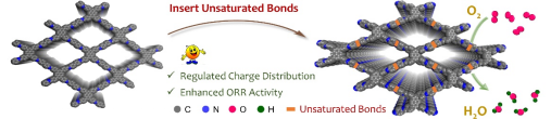 由于不饱和键/配位不饱和环境可有效提供催化活性位点和电荷传输通道。例如,在金属基催化剂中,其配位不饱和特性可以显著促进反应物的化学吸附,并通过快速的界面电荷转移诱导高电子电导率,从而增强电催化活性。在非金属碳基催化剂中,各种不饱和形式的碳材料,特别是sp或sp2杂化原子很容易被活化,也被证明是优化氧吸附能和提高性能的有效方法。然而,目前仍缺乏有效的策略来精确控制此类催化体系中不饱和态的结构以及不饱和位点在整个结构中的催化反应机制。