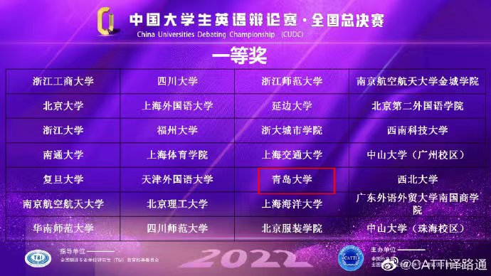 中国大学生英语辩论赛,由全国翻译专业学位研究生教育指导委员会指导,中国外文局CATTI项目管理中心主办。比赛分为校园选拔赛、大区赛(华东、华南、华北、华西四个大区)和全国总决赛,今年共有500余所高校参加,参赛人数超过20万人次。124所高校通过4个大区决赛入围上周末揭幕的全国总决赛。我校辩论队在华东大区赛中表现突出,成功晋级全国总决赛。在总决赛赛场上,两位辩手思维清晰、逻辑缜密,最终以优异成绩跻身全国32强,荣获一等奖,在全国英语辩论赛舞台上展现出青大学子昂扬向上、勤学善思的风采。