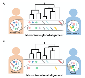 图1.微生物组beta多样性距离计算的(A)全局比对模式与(B)局部比对模式