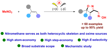 张月霞副教授和傅爱萍教授合作,成功将电合成方法应用于异噁唑啉类化合物的高效合成,发展了一种通过电活化硝基甲烷在温和条件下一步构建异噁唑啉醛肟的方法。这是首例一步合成异噁唑啉醛肟的报道,之前报道的合成方法需要四步。该方法由价廉易得的硝基甲烷和烯烃一步构建了异噁唑啉醛肟,硝基甲烷经电活化不仅构筑了异噁唑啉杂环骨架,同时还提供了肟官能团。该合成方法具有反应条件温和、原子经济性和步骤经济性高、底物范围广、立体选择性高、可放大量等优点。利用该方法不仅成功合成了60多个异噁唑啉醛肟化合物,还高效合成了除草剂安全剂双苯噁唑酸(isoxadifen-ethyl)和系列杀虫剂合成关键中间体,这均体现出该方法良好的应用潜力和前景。