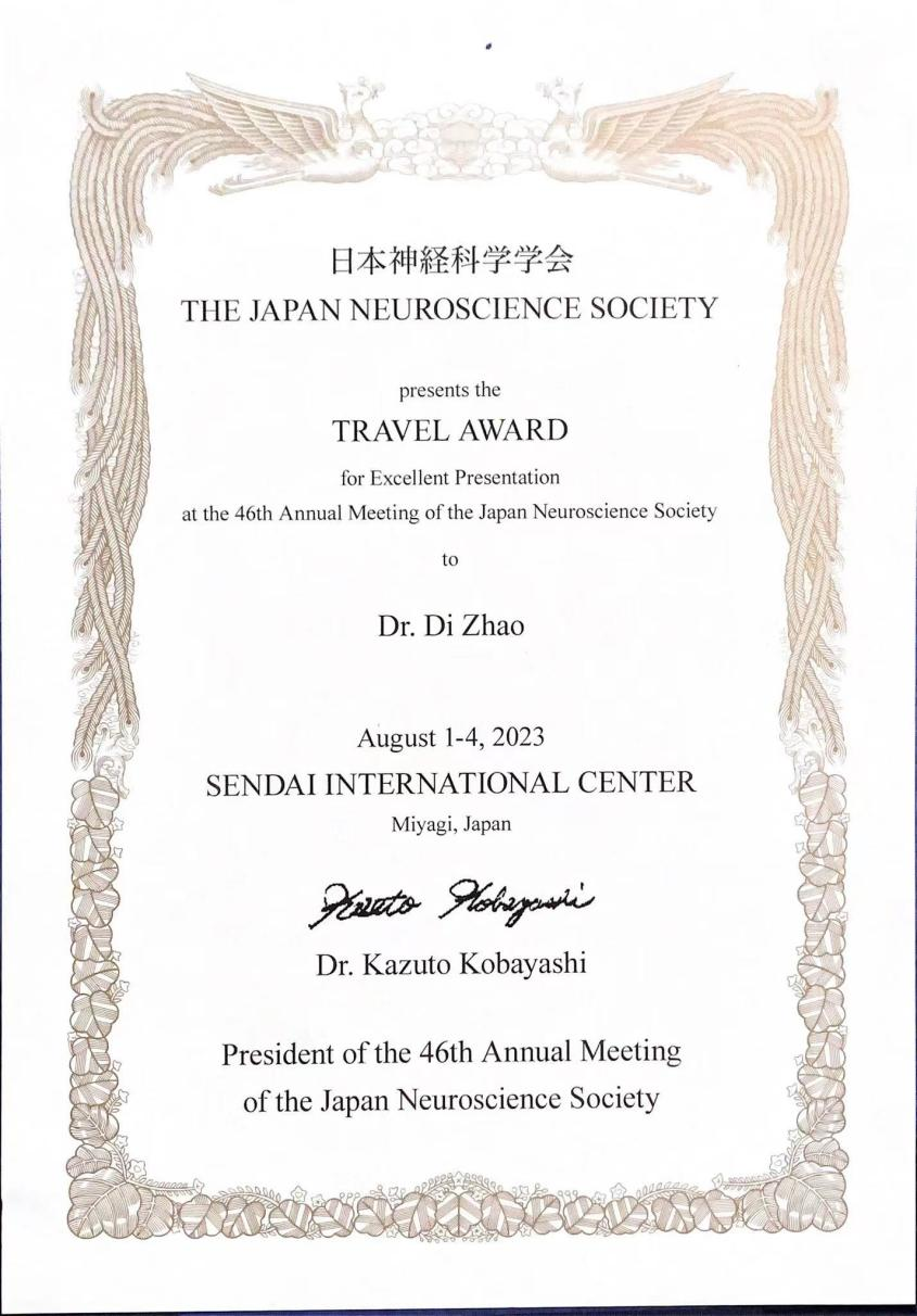 新闻网讯 近日,经中国神经科学会推荐,我校脑科学与疾病研究院青年教师赵娣获得2023年度日本神经科学学会旅行奖(JNS Travel Awards),成为本年度全国6位赴海外交流的青年学者之一,受邀参加日本神经科学学会第46届年会并做学术交流。