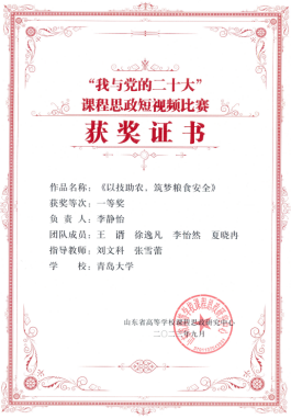 新闻网讯 近日,由山东省教育厅指导,山东省高等学校课程思政研究中心组织开展的“我与党的二十大”课程思政短视频比赛结果公布,我校在本次比赛中获一等奖一项、二等奖3项、三等奖3项,这是我校近年积极开展课程思政建设的又一成绩。