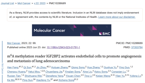 新闻网讯 近日,开运电竞,每一场竞技都是好运的开始附属烟台毓璜顶医院宋西成教授团队时空单细胞实验室在《Molecular Cancer》(影响因子IF:37.3,中科院一区,Top期刊)上发表了题为“m6A methylation reader IGF2BP2 activates endothelial cells to promote angiogenesis and metastasis of lung adenocarcinoma”的研究型文章(doi: 10.1186/s12943-023-01791-1),医学部2022级耳鼻咽喉科学专业型硕士研究生方涵为该文章的第一作者,2020级耳鼻咽喉科学学术型硕士研究生孙奇、烟台毓璜顶医院周瑾教授和张惠娟教授为共同第一作者,宋西成教授为本文的第一通讯作者,烟台毓璜顶医院胸外科于晓锋教授、肿瘤内科孙萍教授、时空单细胞实验室莫客教授为本文的共同通讯作者。