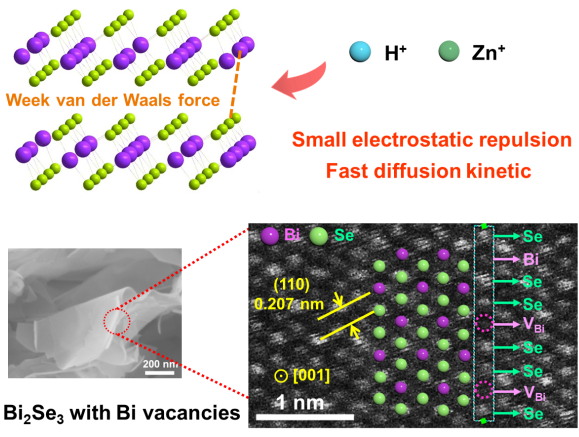 水系锌离子电池(ZIBs)的挑战在于找到合适的正极材料,提供高的容量和快速的离子存储动力学。与目前常用的金属氧化物正极相比,硒化铋(Bi2Se3)拓扑绝缘体具有表面金属态带来的高导电性贡献、良好的热稳定性等优势。然而,由于锌离子电池中二价载流子与正极基体间大的晶格库仑势场导致离子输运能力不足,块体硒化铋体相半导体特性造成的电子导电性不高等缺陷,普通硒化铋正极仍然不能满足智能可穿戴储能应用中的高载量设计需求。基于此,本文通过一步水热法构建了具有丰富的铋阳离子空位二维Cu-Bi2-xSe3纳米片正极材料。研究显示,富阳离子空位的Cu-Bi2-xSe3纳米片(4 nm)因大的表面拓扑金属态贡献表现出更高的电子导电性,同时实现了增强的体相导电性,且DFT计算表明,丰富的阳离子空位可以显著降低锌离子的输运能垒,提高载流子的可逆快速存储。因此,通过此“一石三鸟”的简单设计策略,同时提高了Bi2Se3正极的离子和电子传输能力,从而实现电极材料优异的长循环寿命、大倍率和高载量性能。此外,在固态纤维锌离子电池的可穿戴应用上,电池表现出高的柔韧性和可编织性,体现其良好的应用潜力。