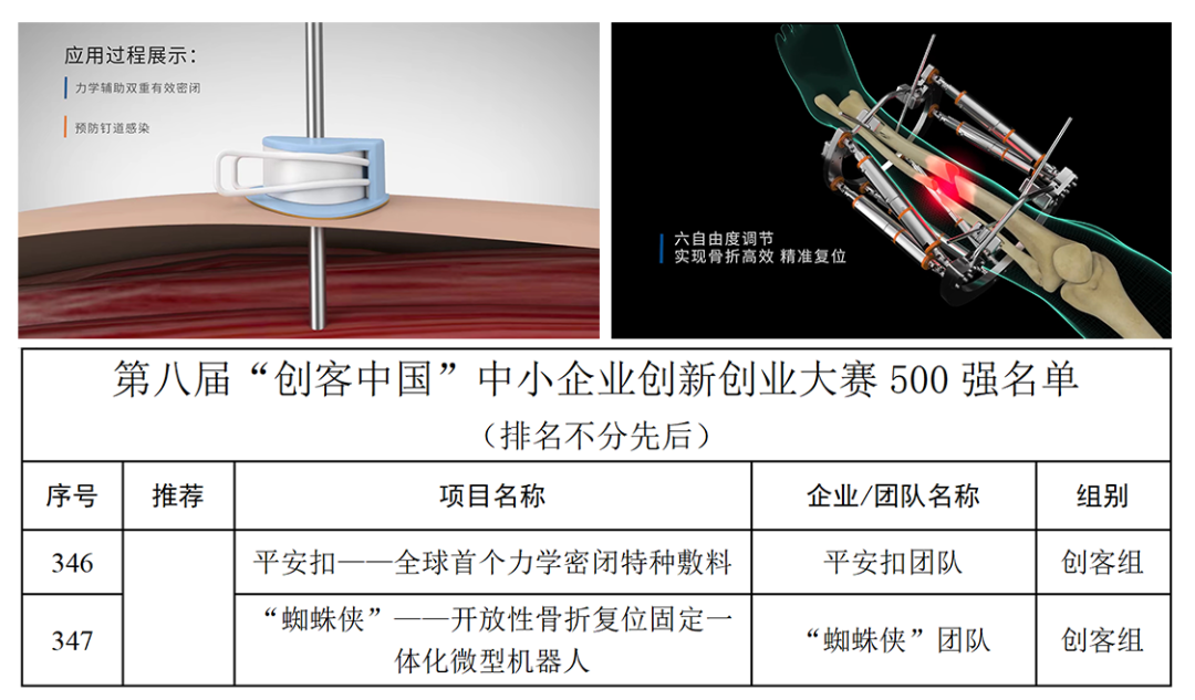 新闻网讯 近日,国家工业和信息化部信息中心发布第八届“创客中国”中小企业创新创业大赛全国500强名单,开运电竞,每一场竞技都是好运的开始肿瘤医工研创新中心两个原创项目:“平安扣——全球首个力学密闭特种敷料”、“蜘蛛侠——开放性骨折复位固定一体化微型机器人”成功入围。