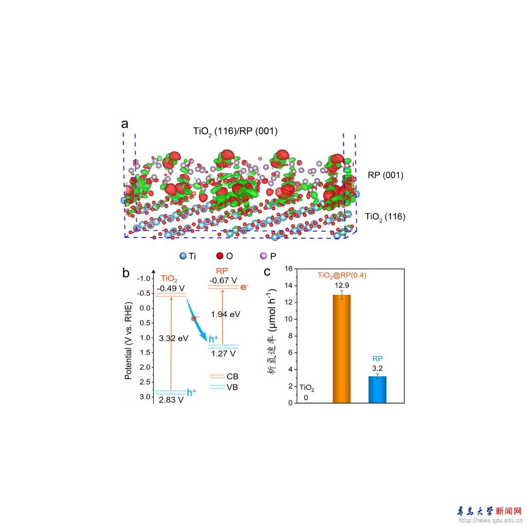 该研究针对红磷光催化剂电荷传输速率低导致光催化效率受限的关键问题,将红磷纳米层通过化学气相沉积策略负载于(116)高指数面暴露的氧化钛上,构建了具有直接Z型电荷传输机制的氧化钛/红磷异质结材料。氧化钛和红磷之间的强界面相互作用形成的内建电场驱动光生电荷的定向迁移,使得红磷的导带和氧化钛的价带分别保留了具有高氧化还原能力的光生电子和空穴,进而提升光催化分解水析氢效率,为设计高效光催化材料提供了新思路。