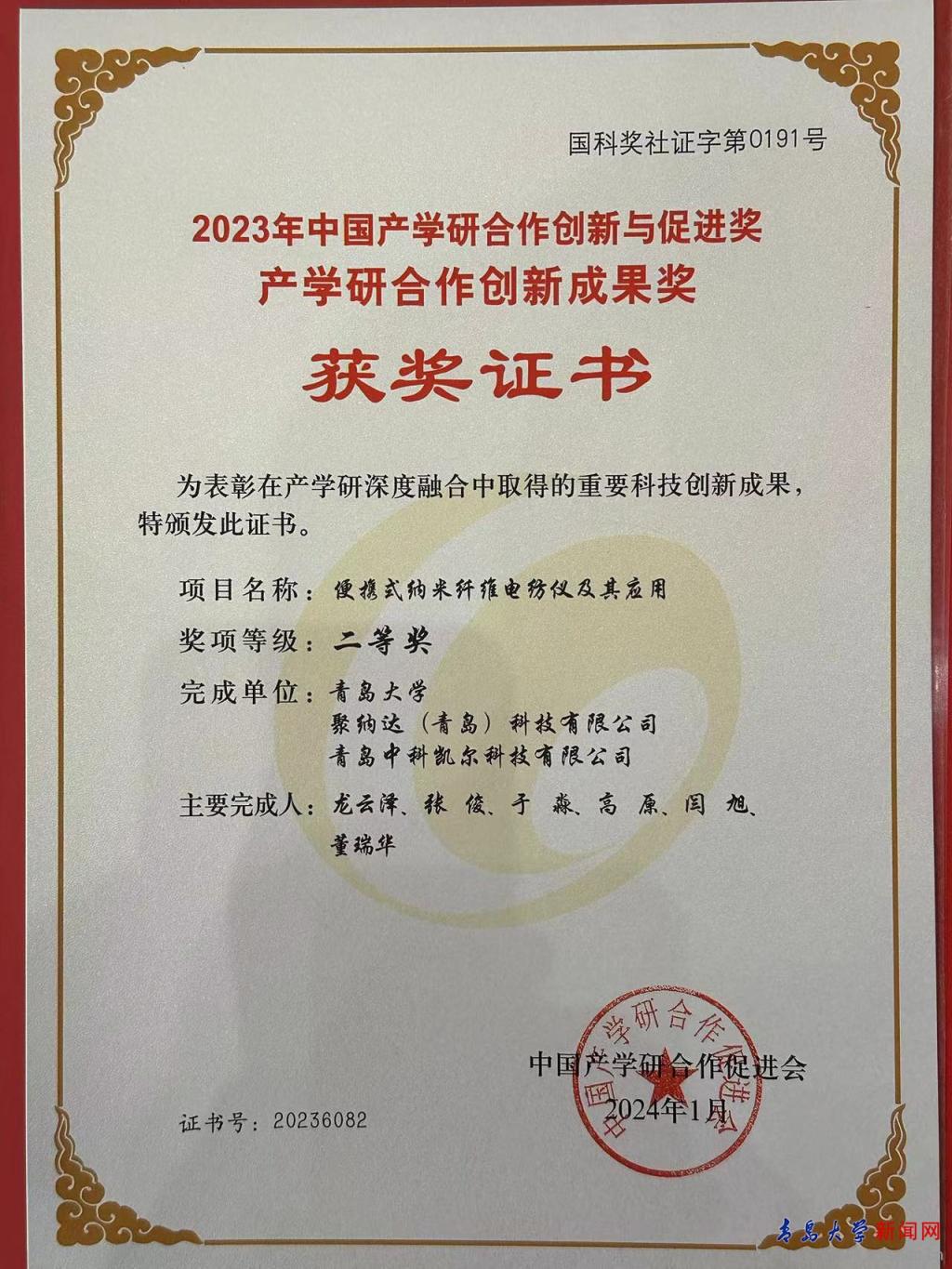 新闻网讯 3月17日,第十五届中国产学研合作创新大会在北京举办,大会以“产学研聚焦:新动能 新模式新产业”为主题,探讨如何通过产学研协同创新将科教兴国、人才强国、创新驱动发展战略落到实处,打好关键核心技术攻坚战,发展新质生产力,支撑引领现代化产业体系建设,加快实现高水平科技自立自强,推动国家高质量发展。会议隆重颁发了2023年中国产学研合作突出贡献奖、创新奖、促进奖、创新成果奖、工匠精神奖,我校物理科学学院龙云泽、张俊团队的成果《便携式纳米纤维电纺仪及其应用》荣获2023年中国产学研合作创新成果奖二等奖。