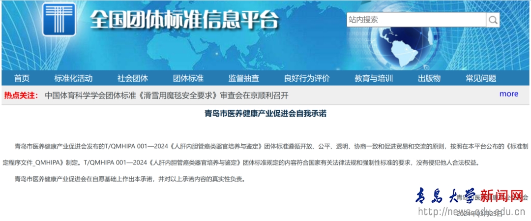 新闻网讯 3月25日,我校医学部转化医学研究院王栋和李菁团队参与海尔国际细胞库(青岛海尔生物科技有限公司)领衔起草的《人肝内胆管癌类器官培养与鉴定》(T/QMHIPA 001—2024)团体标准由青岛市医养健康产业促进会正式发布,在医教研产业化方面取得重大突破。