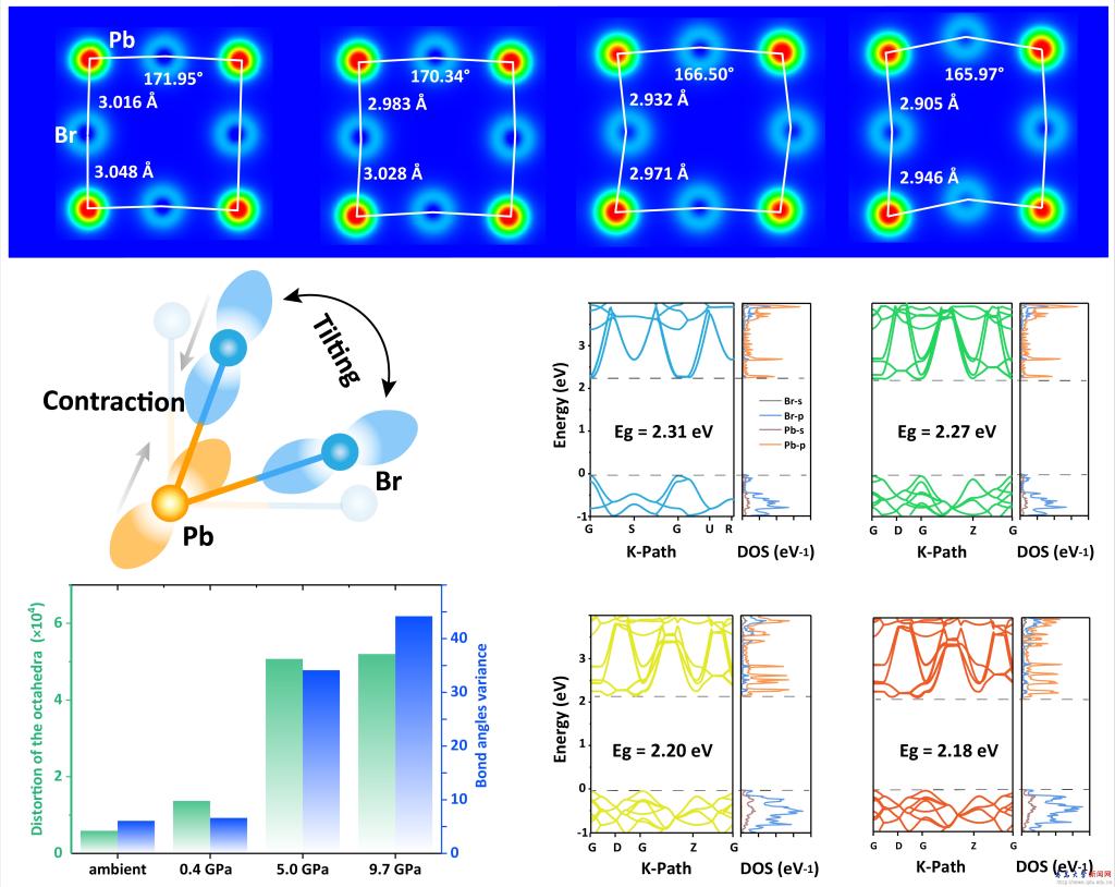 二维有机-无机杂化卤化铅材料因其独特的量子限域效应在光电器件研究中备受关注。然而,这类材料在常压下结构变化小,荧光发射不易实现宽光谱覆盖,难以满足多种应用场景的要求。高压作为独立于温度与组分的物理参量,可以有效调控材料晶格中的原子距离和电子结构,已发展成为设计合成新材料与性能调控的重要手段。本研究团队设计制备出一例压力调控荧光发射的二维杂化卤化铅材料,(ETA)2PbBr4(ETA =乙醇胺阳离子)。在静水压调控下,其发光范围可由蓝紫光区(424 nm)调谐至橙红光区(620 nm);同步辐射高压X-射线衍射和高压拉曼实验证实,晶体在静水压作用下,经历了由常压相Pbcn到高压相P21/c的相转变过程。理论计算与机制研究揭示了不同压力下晶体结构演化过程和能带结构变化,以及化学氢键相互作用在高压相转变过程和高压全可见光谱发射的重要作用。该工作为实现单一组分材料的全光谱覆盖发射提供了新的解决方案,有助于推动基于单一组分光电器件的进一步发展。