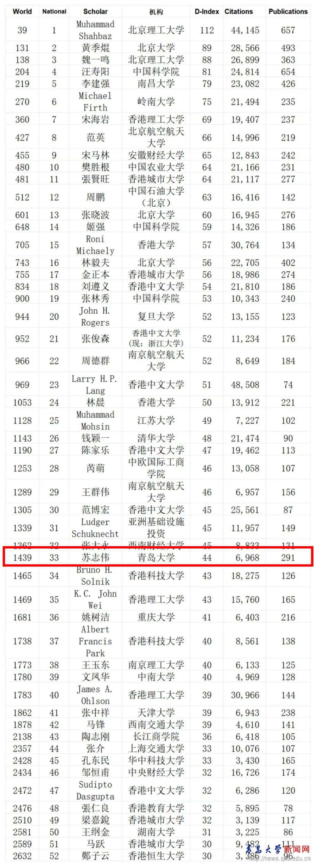 通过对10067名经济金融领域的学者分析发现,中国有52名学者入选,与上一版的排名相比,增加了10位学者。我校经济学院苏志伟教授入选经济金融领域顶尖科学家名单,位列第33位。