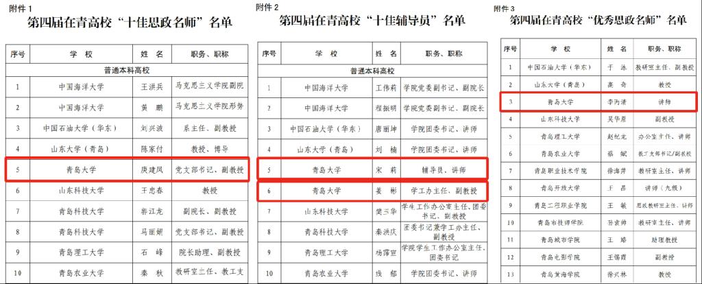 新闻网讯 近日,中共青岛市委教育工作委员会印发《关于第四届在青高校“十佳思政名师”“十佳辅导员”的表扬通报》,我校马克思主义学院教师庚建凤获“十佳思政名师”、李丙清获“优秀思政名师”,青岛医学院辅导员宋莉、教育科学学院辅导员姜彬获“十佳辅导员”。