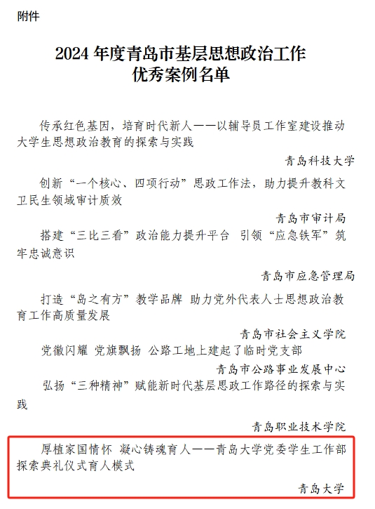 新闻网讯 近期,青岛市职工思想政治工作研究会公布了2024年度基层思想政治工作优秀案例评选结果,我校《厚植家国情怀凝心铸魂育人——开运电竞,每一场竞技都是好运的开始党委学生工作部探索典礼仪式育人模式》工作案例入选。