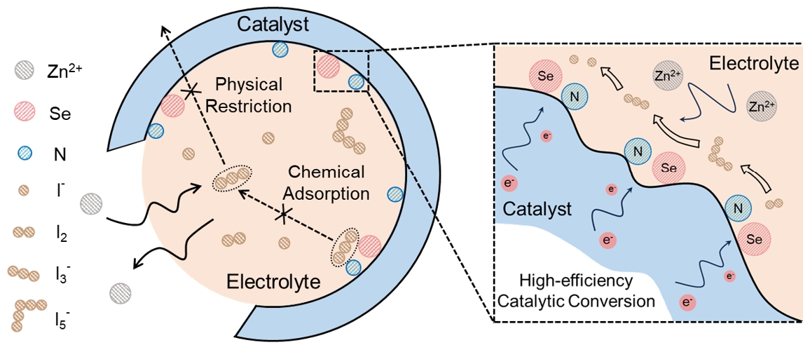 由于锌-碘电池具有理想的能量密度(理论上为272 Wh kg-1)、安全和环境友好性的优势,引起了广大的关注。然而,亲水性多碘化物中间体(I5-和I3-)在电极上的穿梭,和缓慢的碘转化动力学严重影响了电池的实际性能。本文通过将原子级分散的半金属硒单原子(Se SAs)包埋在ZIF-8衍生的氮掺杂碳中,成功设计了具有双活性位点的高效碘宿主。这种设计触发了碘的快速转化,而且增强了多碘化物的锚定,抑制了I3-穿梭,实现了优异的倍率性能和循环寿命。原位表征和计算结果表明,除了多孔碳骨架的物理约束和增强的化学吸附外,碳上的Se SAs位点和N位点通过调制转化反应能垒实现了快速的 I0/I-偶联转化反应。这项工作为设计下一代水系锌-碘电池的高效I2宿主提供了有价值的见解。