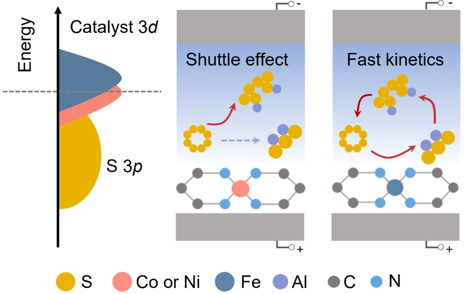 可充电铝硫电池因其独特的多电子氧化还原特性(S8↔Al2S3)与1675 mAh g-1的超高理论容量,近年来受到广泛关注并被视为最具应用前景的储能体系之一。在本工作中,研究人员制备了不同电子结构的铁磁性单原子负载多孔碳材料PC-SAFAs作为铝硫电池的催化,从电子结构角度出发,对不同过渡金属单原子催化剂与多硫化物轨道杂化状态进行分析,验证了催化剂自旋极化的提升对电化学性能有明显的改善。实验表明,当未配对电子数最多的PC-SAFe/S作为铝硫电池正极时,电池表现出了更优异的循环稳定性和倍率性能。对催化机制进行研究,发现该催化剂与多硫化物结合时,轨道杂化程度更强,电子传输更快。通过实验结合理论计算,该文章为设计新型高催化活性电催化剂提供了新的设计思路。