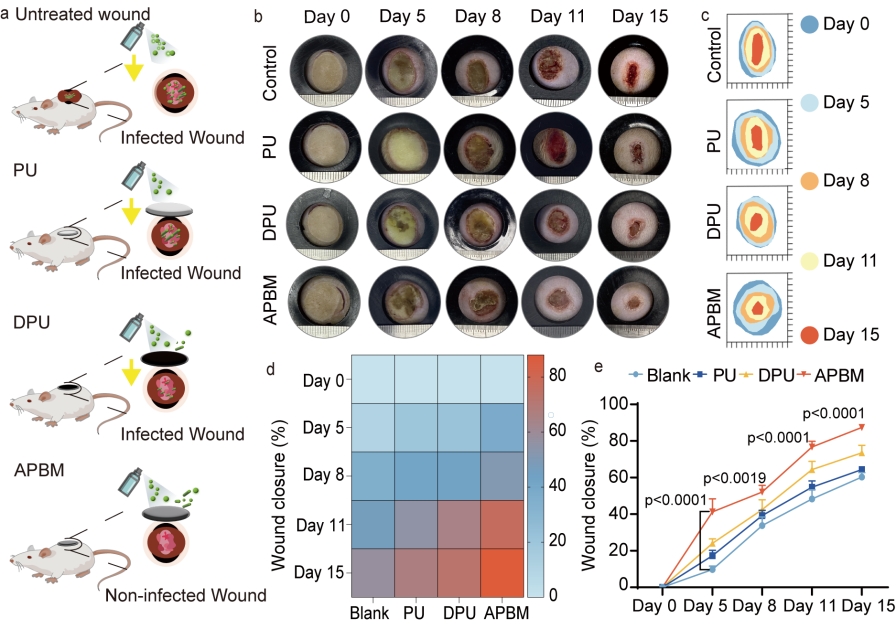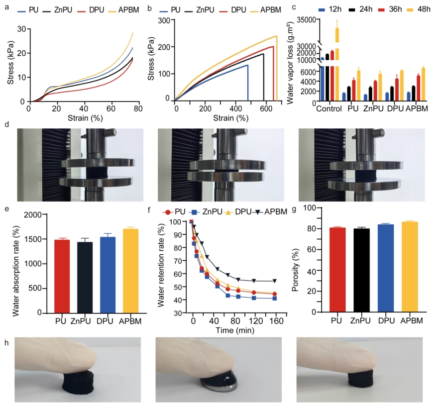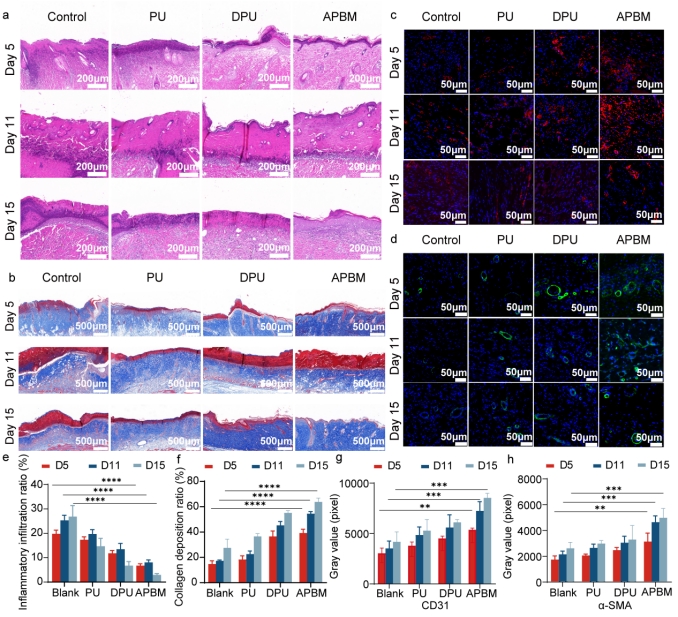 在大鼠全层皮肤缺损模型中,APBM展现出显著的促愈效果:术后第15天,实验组创面愈合速度较对照组提升27.5%。组织学分析结果表明APBM胶原蛋白沉积量为对照组的3倍。炎性浸润程度少于对照组的4倍。CD31、α-SMA的表达量均为对照组的2倍。其综合性能显著优于单一抗菌策略敷料和传统聚氨酯海绵。