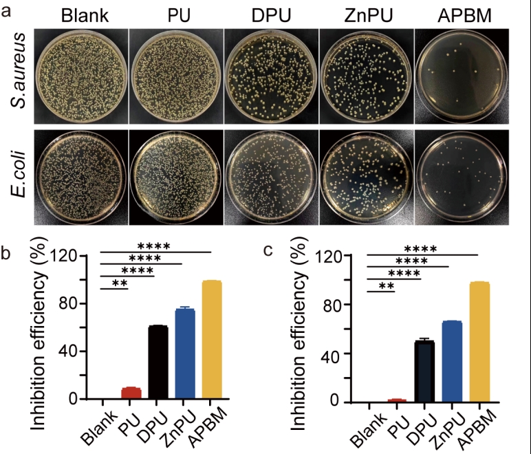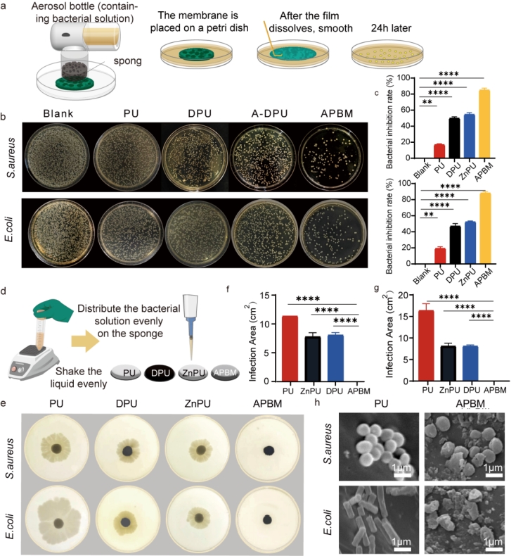 通过创新团队设计的全新细菌捕获实验证实,APBM极为高效的阻菌效能。针对大肠杆菌(E. coli)与金黄色葡萄球菌(S. aureus),其阻菌率均超过85%,能够在细菌尚未接触创面之前就发挥作用,提前有效防止细菌侵袭创面 。实验证实,金黄色葡萄球菌和大肠杆菌与APBM接触仅两小时,数量减少达99%。体现了卓越的抗菌效能。