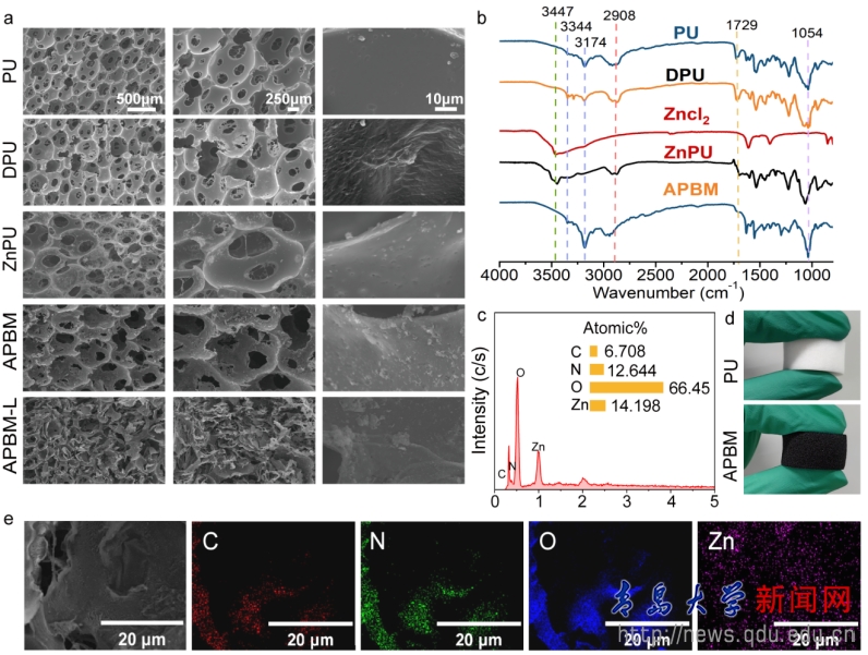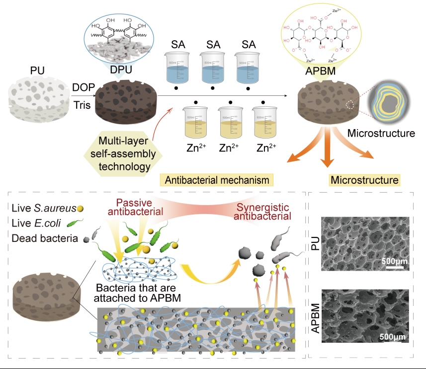 如何将被动阻菌与主动抗菌有机融合,创新团队成功探索出敷料表面处理的“两步法”技术,最终实现高效主被动协同抗菌:一是“阻菌”,利用海藻酸、多巴胺自聚合在聚氨酯海绵表面构建阻隔屏障(被动阻菌),阻止细菌侵入创面。二是“抗菌”,海藻酸与锌离子高效交联,形成持续释放抗菌因子的凝胶层,遇菌即杀(主动杀菌)。同时,通过锌离子形成促愈功能。