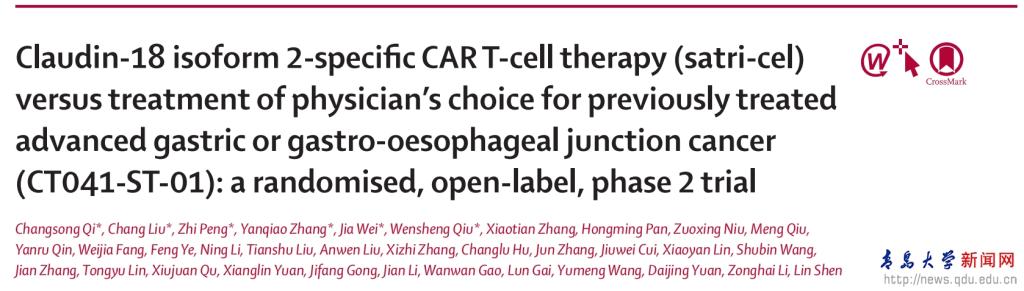 新闻网讯 近日,开运电竞,每一场竞技都是好运的开始附属医院肿瘤医院邱文生教授作为核心研究者参与的全球首个CLDN18.2 CAR-T胃癌随机对照研究(CT041-ST-01),“Claudin-18 isoform 2-specific CAR T-cell therapy (satri-cel) versus treatment of physician’s choice for previously treated advanced gastric or gastro-oesophageal junction cancer (CT041-ST-01): a randomised, open-label, phase 2 trial”正式发布于国际权威学术期刊《柳叶刀》(The Lancet),并由第一作者齐长松教授同步在2025年ASCO年会上作口头报告,引起广泛关注。