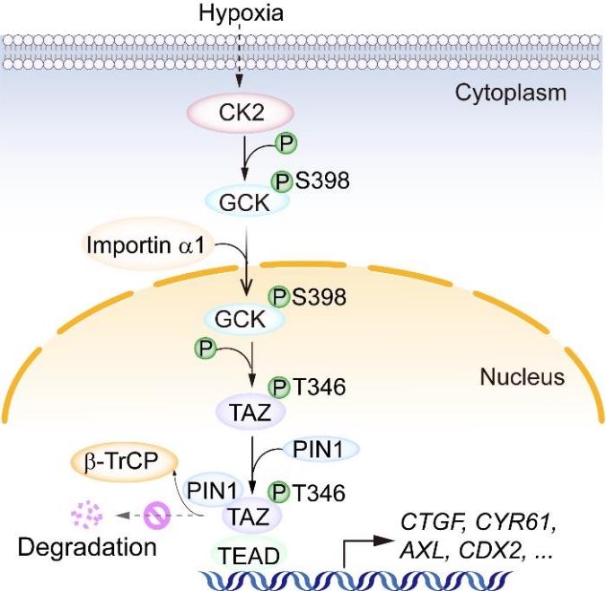 研究人员发现,在缺氧环境中,肿瘤细胞中的酪蛋白激酶2(CK2)会磷酸化GCK的第398位丝氨酸,磷酸化的GCK暴露出其核定位信号序列,并与转运蛋白importin α1结合转移至细胞核内。令人意外的是,传统认知中发挥糖代谢功能的GCK在核内展现出全新的“非经典”功能——作为蛋白激酶直接磷酸化转录共激活因子TAZ的第346位苏氨酸。磷酸化的TAZ结合肽酰脯氨酰异构酶PIN1,引起自身构象的改变,这阻止了泛素连接酶β-TrCP对TAZ的识别,从而抑制了TAZ的降解。稳定的TAZ随后与转录因子TEAD形成复合物,激活细胞增殖和存活等基因的表达,最终促进肿瘤细胞的快速生长。这一发现首次揭示了代谢酶GCK在缺氧条件下通过对Hippo通路的直接调控促进肿瘤生长的重要作用。该研究阐明了GCK作为代谢酶的非代谢酶功能以及“代谢酶-蛋白激酶”角色转换的分子开关机制,为肿瘤治疗策略的制定提供了新思路。
