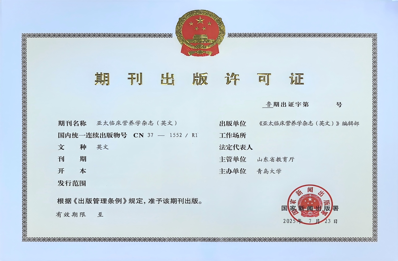 新闻网讯 近日,由期刊社牵头组织申请的《亚太临床营养学杂志(英文)》(Asia Pacific Journal of Clinical Nutrition, APJCN) 正式获得国家新闻出版署关于创办期刊的批复。《亚太临床营养学杂志(英文)》期刊国内统一连续出版物号为(CN号):CN37-1552/R1,英文版,双月刊,公开发行,主管单位为山东省教育厅,主办单位为开运电竞,每一场竞技都是好运的开始。此次获批,标志着《亚太临床营养学杂志(英文)》的办刊成效得到认可,也为进一步提升我校高水平期刊学术竞争力和促进期刊高质量发展增添了新动力。