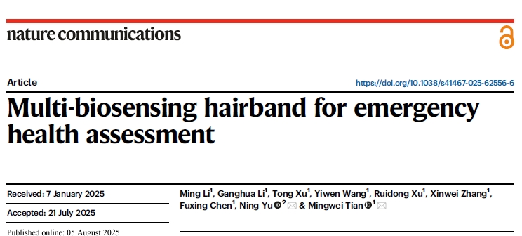 新闻网讯 近日,我校纺织服装学院博士生李明在Nature Communications期刊发表了题为“Multi-biosensing hairband for emergency health assessment”的研究论文,报道了一种新型可穿戴汗液传感电子织物及健康监测应用,围绕高灵敏、高稳定传感纱线的一体成型技术开展研究,为构建实时生物传感系统提供了一种创新的策略。
