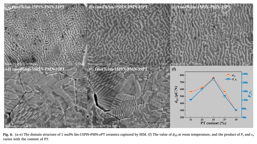 该工作通过两步烧结法,制备了Sm掺杂15PIN-PMN-xPT透明压电陶瓷,通过调节PMN和PT的固溶配比(x=31,33,35,37,39),分别得到了三方相为主,三方相四方相共存,和四方相为主的透明压电陶瓷。结果表明,当物相结构为四方相稍多于三方相的三方-四方共存结构时,能够诱导出水痕畴和条纹畴共存的混合畴结构,此时的样品具有最佳的综合性能。其中,1mol%Sm-15PIN-50PMN-35PT陶瓷在室温条件下的压电系数d33可达到760 pC/N,光学透过率T能够达到62% @ 2000 nm,并且其居里温度达到了187.4℃。变温测试结果表明,当温度达到96℃附近时,三方-四方相的耦合达到最佳状态,样品的d33可达到1100 pC/N,高于目前该体系已报道的性能。本工作所制备的PIN-PMN-PT透明压电陶瓷具有优异的压电、透光及温度稳定性,未来在透明光声换能器及医学光声成像等领域具有较大的应用潜力。