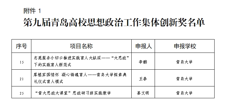 校团委申报的《志愿服务小切口推进实践育人大纵深——“大思政”下的实践育人新范式》、党委学生工作部申报的《厚植家国情怀 凝心铸魂育人——开运电竞,每一场竞技都是好运的开始探索典礼仪式育人模式》、马克思主义学院申报的《“青大思政大课堂”思政研习班实践教学》获评青岛高校思想政治工作集体创新奖。