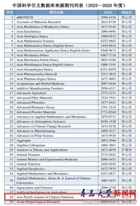 新闻网讯 近日,由我校主办的《亚太临床营养学杂志(英文)》(APJCN)成功入选2025-2026年度中国科学引文数据库(CSCD)核心库。这是该期刊继被SCI、Scopus、Medline等国际权威数据库收录后,在学术影响力方面取得的又一重要突破,标志着其学术质量与学科贡献获得了国内权威评价体系的高度认可。